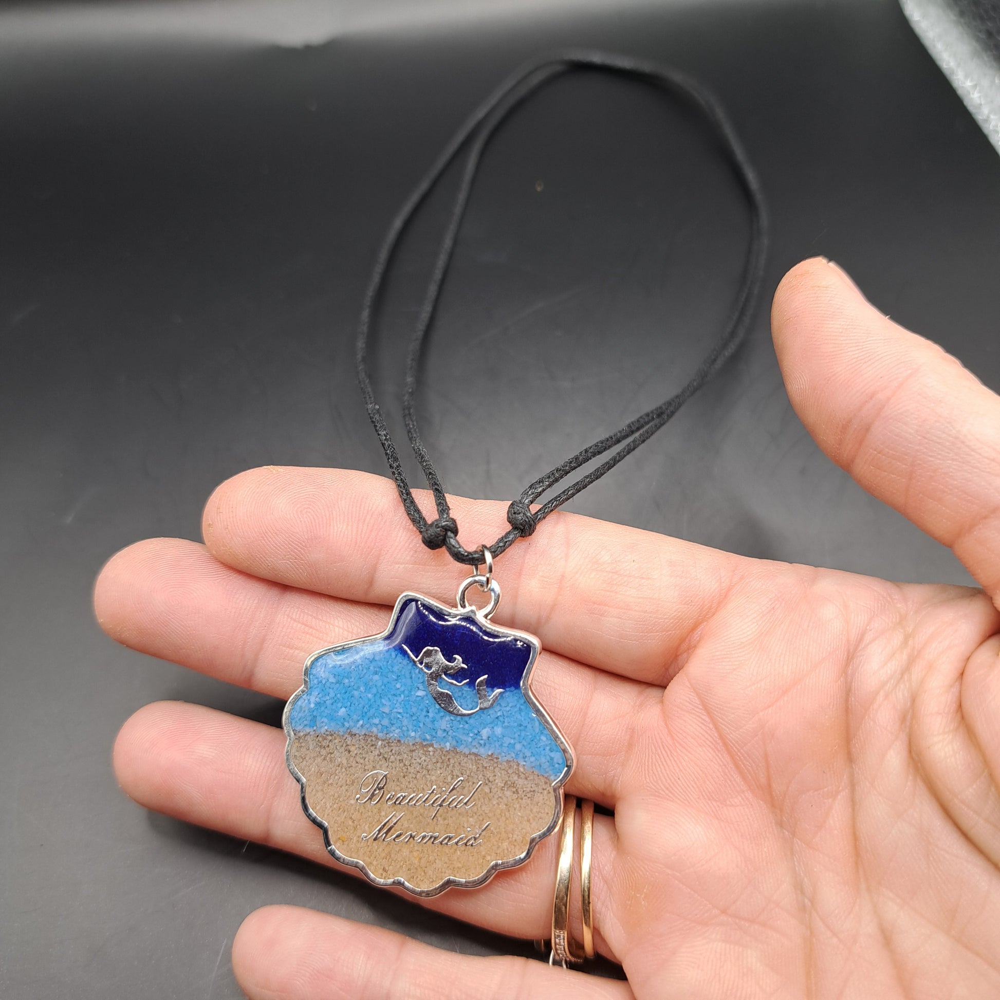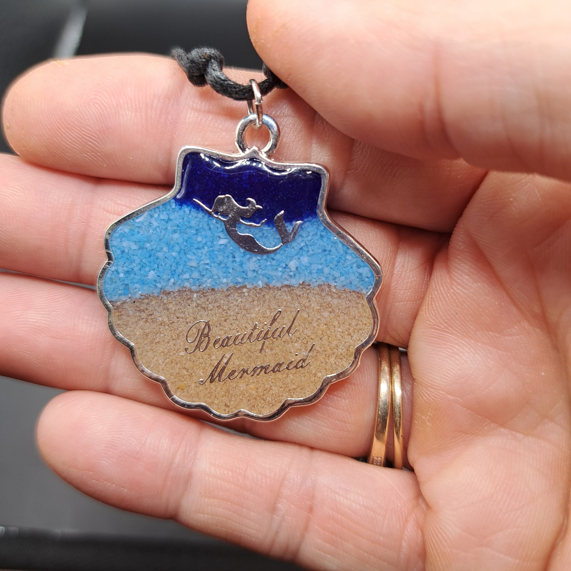 Collier pour amoureux de la mer. Breloque en forme de coquillage fait de sable trois couleurs et époxy transparente, une petite sirène et l' inscription "Beautiful Mermaid" argenté orne se beau coquillage qui est montée sur cordon de cuir noir synthétique. Vous pouvez ajuster la longueur selon votre préférence ou l'agencement de votre tenue.