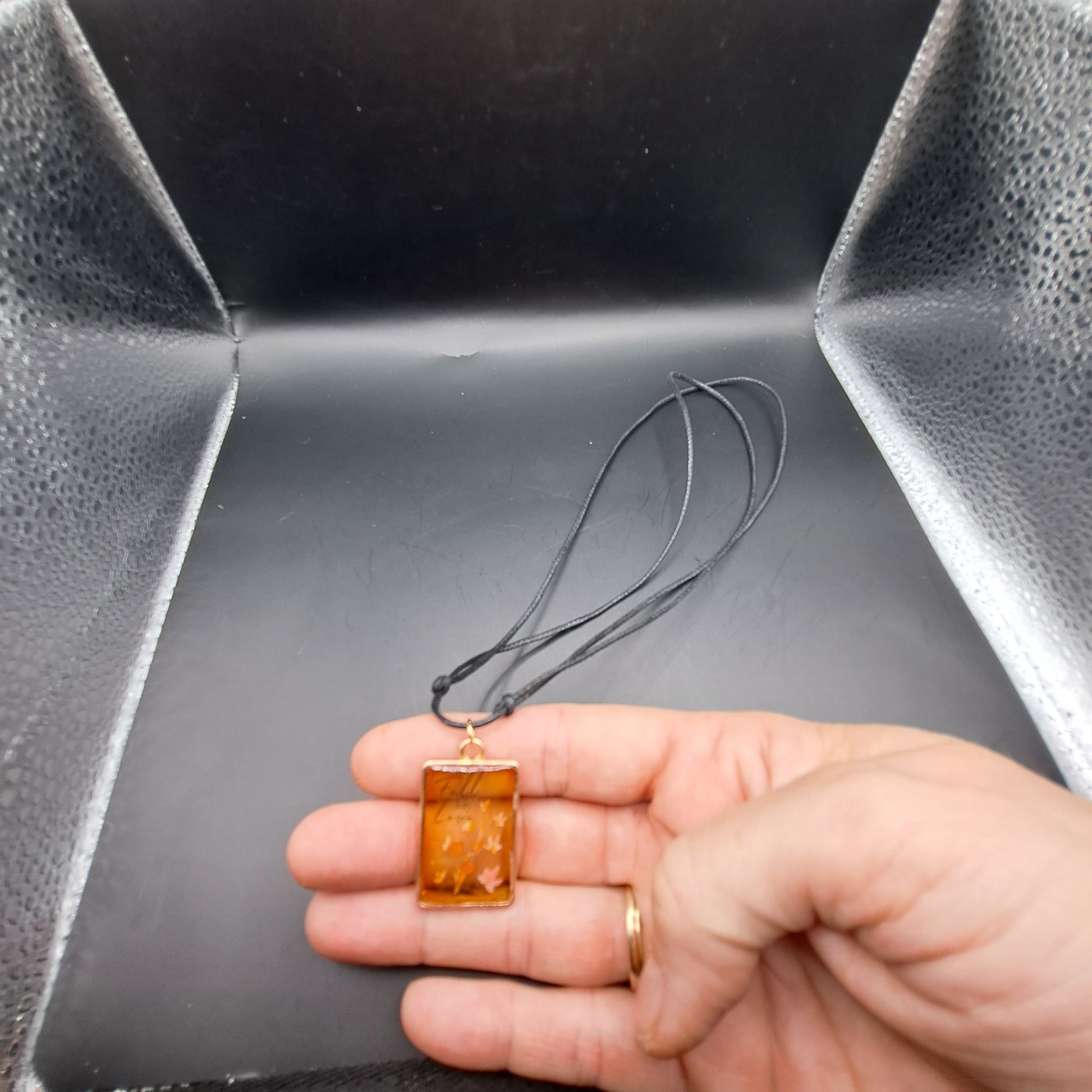 Collier automnal. Breloque en forme de rectangle doré. Il est fait d' époxy orangé. A l' intérieur un décalque de feuille d' automne et les mot " Fall in Love"le rend original. Cette breloque est montée sur un cordon de cuir noir synthétique. Vous pouvez ajuster la longueur selon votre préférence ou l'agencement de votre tenue.