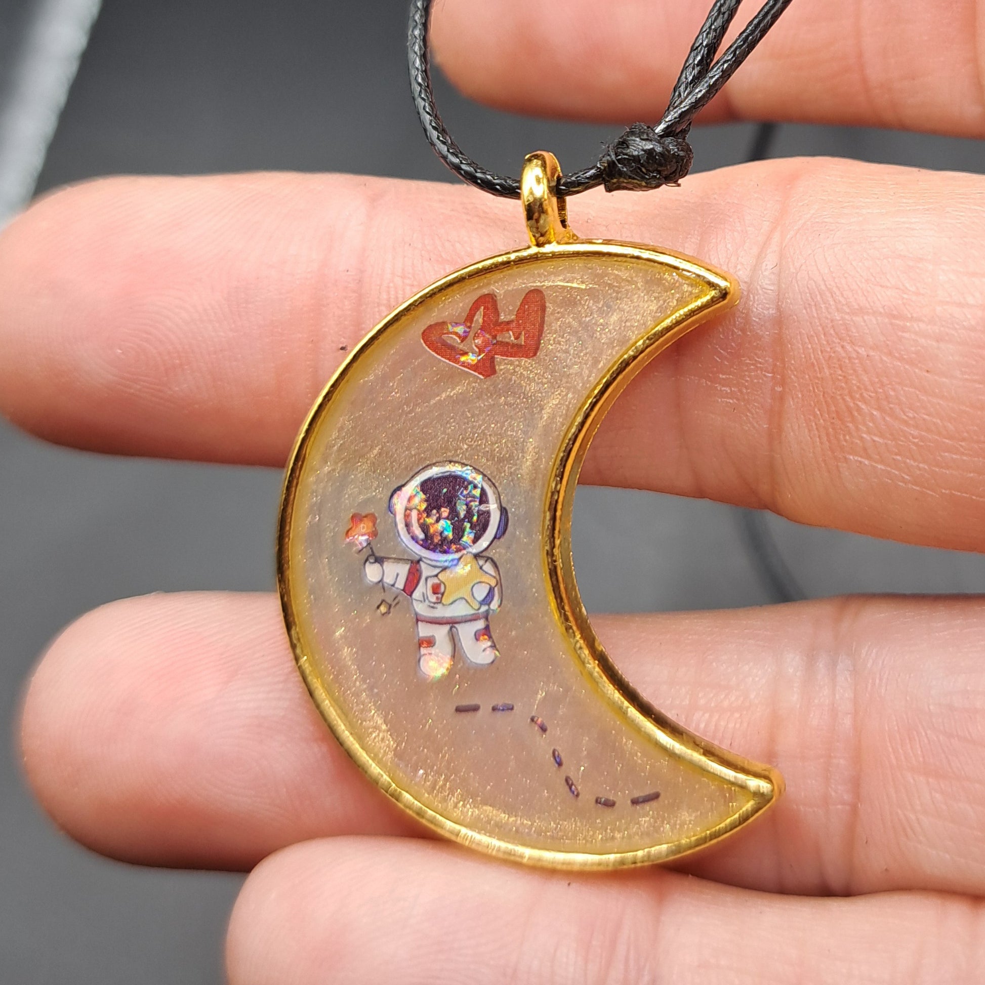 Jolie petite lune dorée. Elle est faite d' époxy dorée et est ornée d' un petit astronaute amoureux. Cette breloque est montée sur un cordon de cuir noir synthétique. Vous pouvez ajuster la longueur selon votre préférence ou l'agencement de votre tenue.