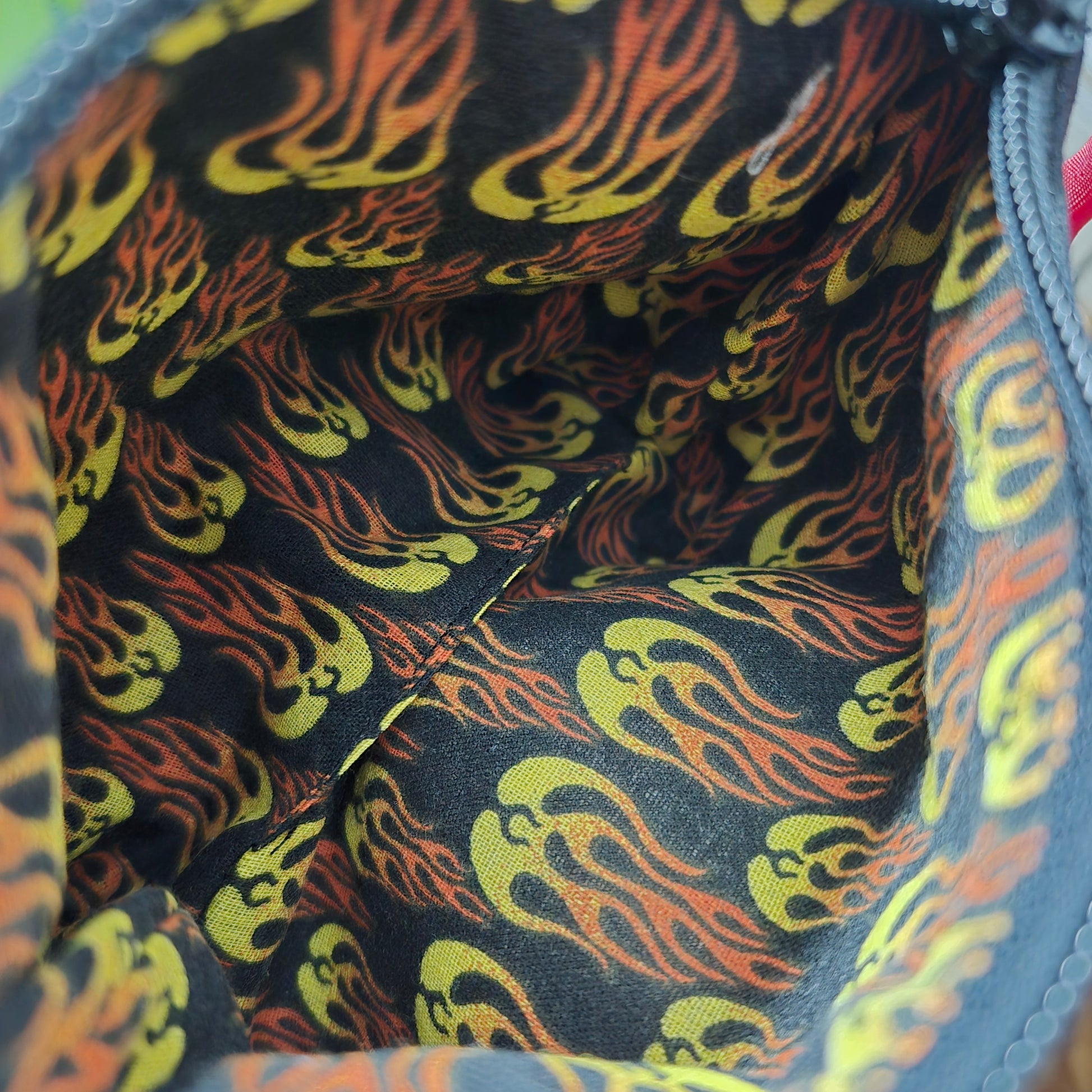 Fait de 100% coton surcyclé, fermeture éclair noir, doublé en tissu 100% coton avec des flammes.