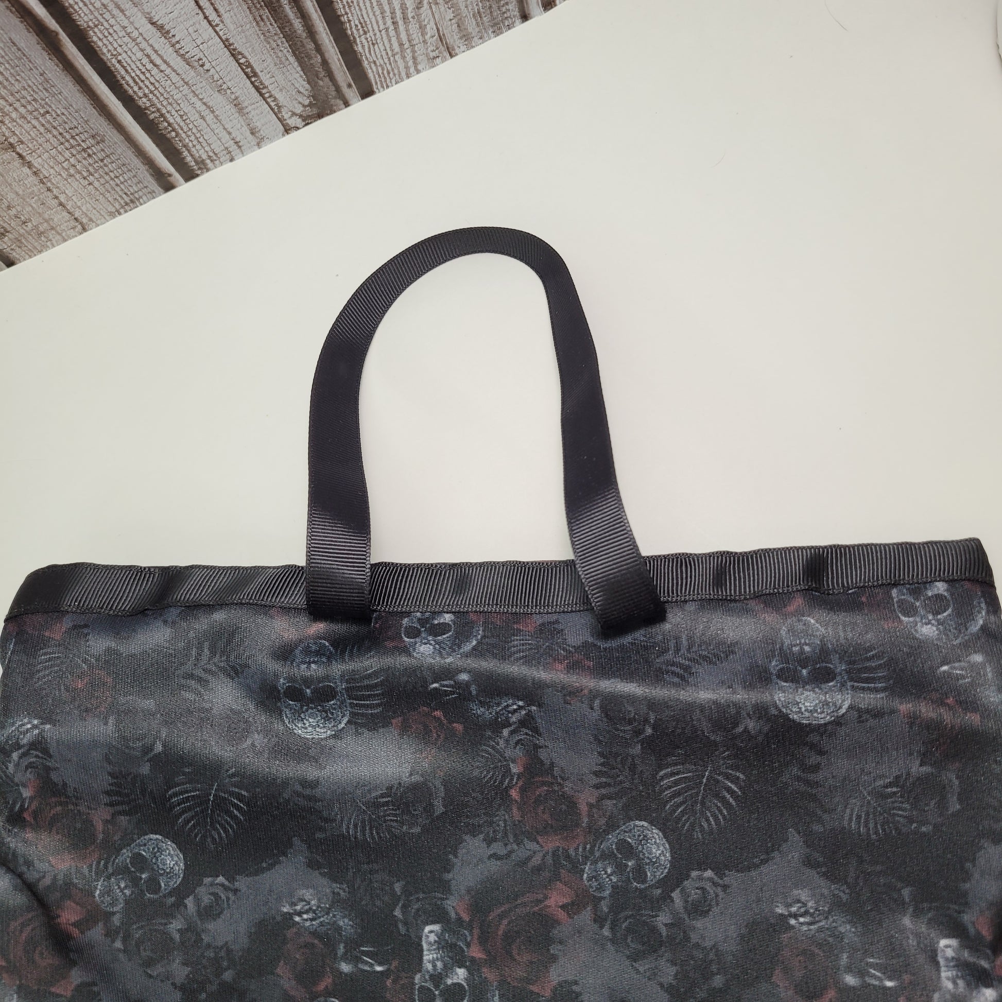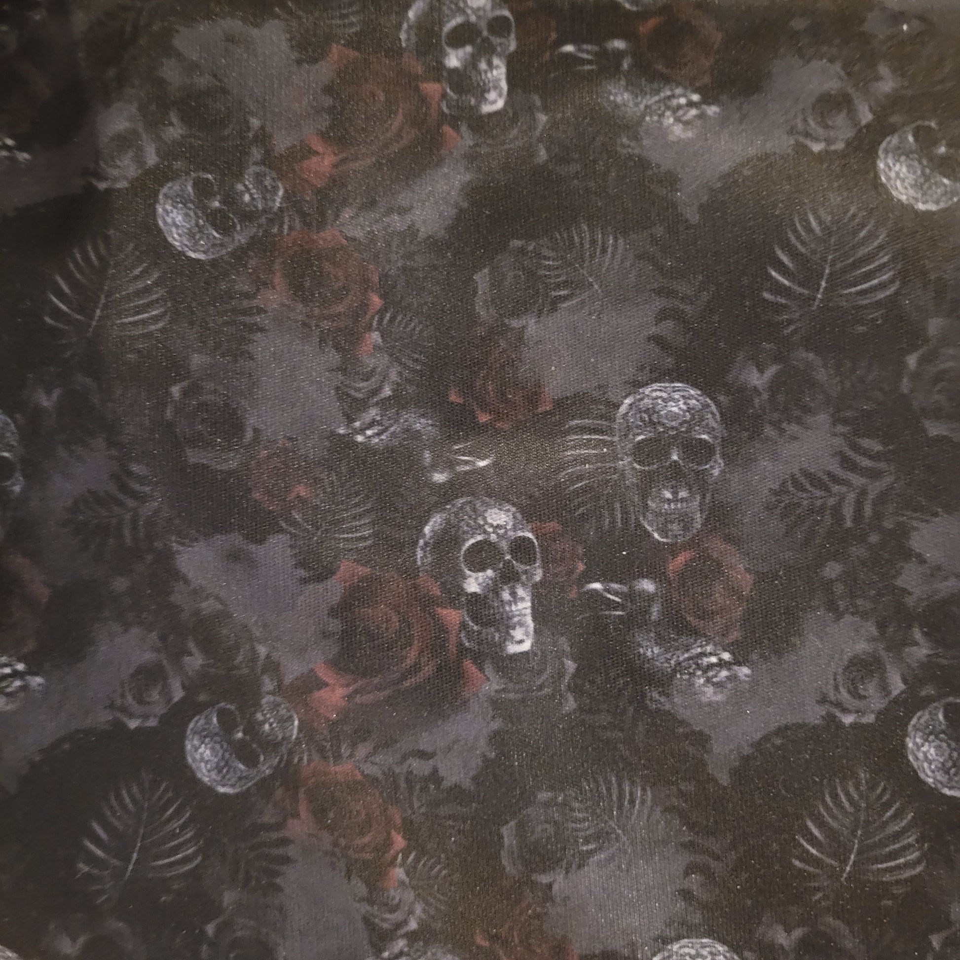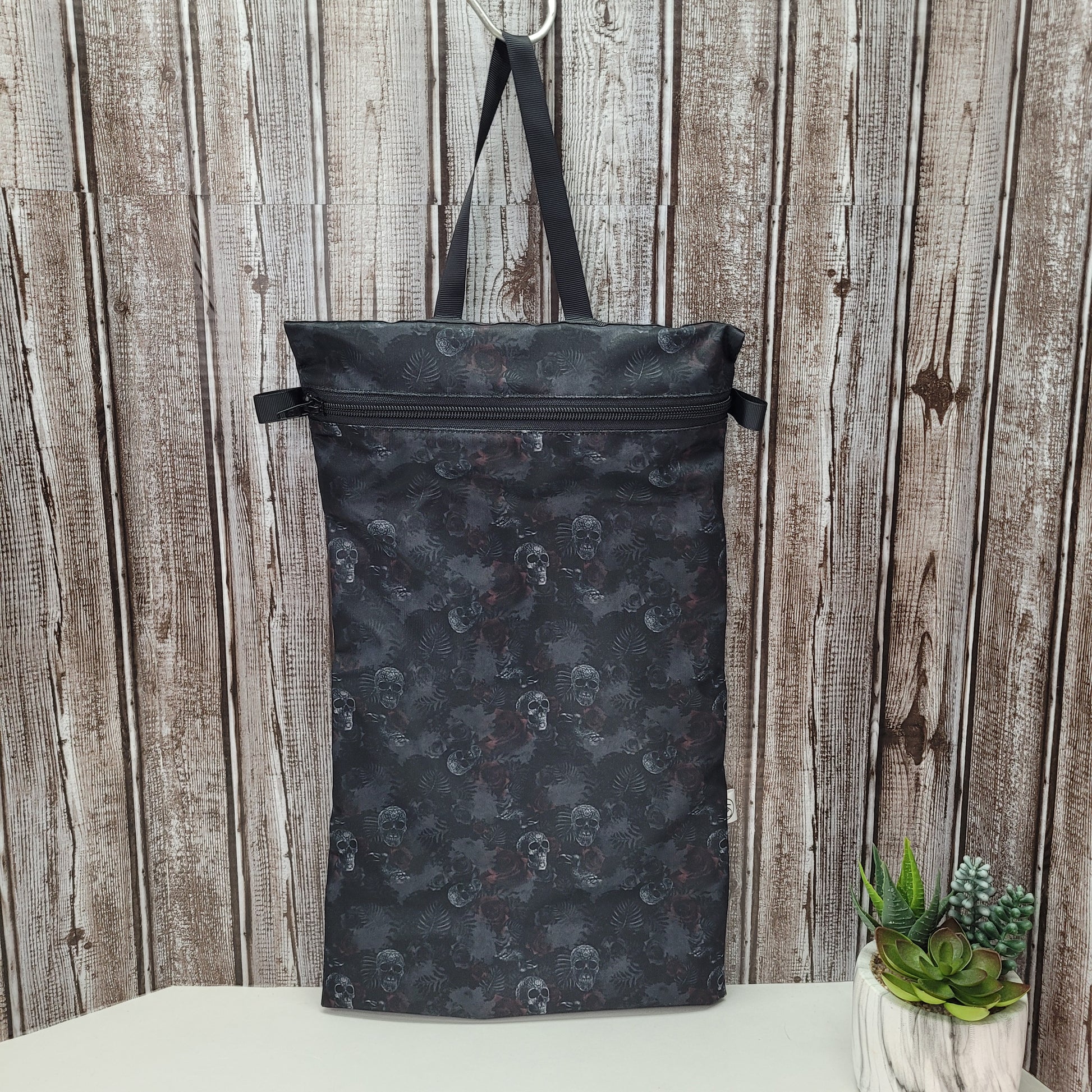 Sac imperméable de transport idéal pour y mettre maillot bain et serviette, vêtements souillés, vêtements de sport et bien plus. Il est imperméable, facile d'utilisation avec son long fermoir et sa petite ganse pour suspendre sur pôle ou crochet. Le fond est conçu pour s'agrandir quand vous y mettez vos vêtements et s'aplatit quand rien dedans pour mieux se plier et serrer. Motifs de têtes de mort avec des roses rouges très subtiles.
